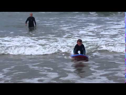 Took Little J to Pacifica today to try out his surfboard. He was soooooo excited to get in the water. He loves his little wetsuit and booties. He thinks he's Batman! The first few waves he almost stood up, but not quite. Then he took a nosedive and had his first tumble in the waves and wasn't sure if he wanted to go back out. But we're so proud that he did!
